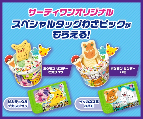 全国のサーティワンアイスクリームで、対象商品のポケモンサンデーを買うと、スペシャルタッグわざピック「ピカチュウ&デカヌチャン」もしくは「イッカネズミ&パモ」がもらえるよ!